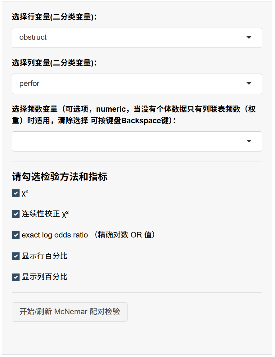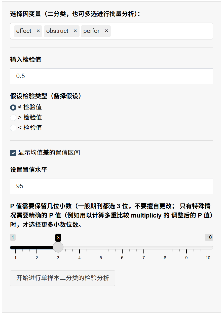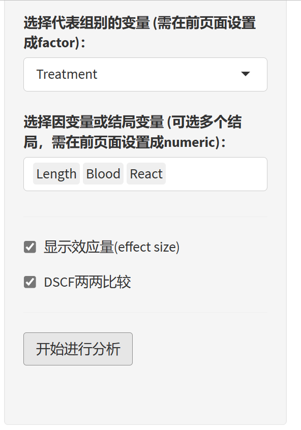 在 “选择分组变量(二分类变量)” 选择恰好两类的变量。- 如果当前是 3 类及以上,请在 “定义字段/调整因子顺序” 合并为两类。