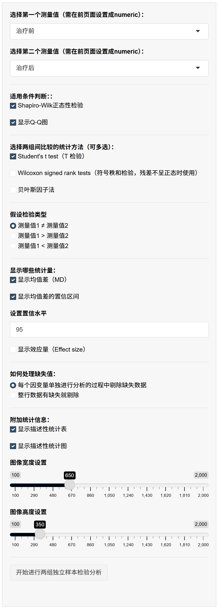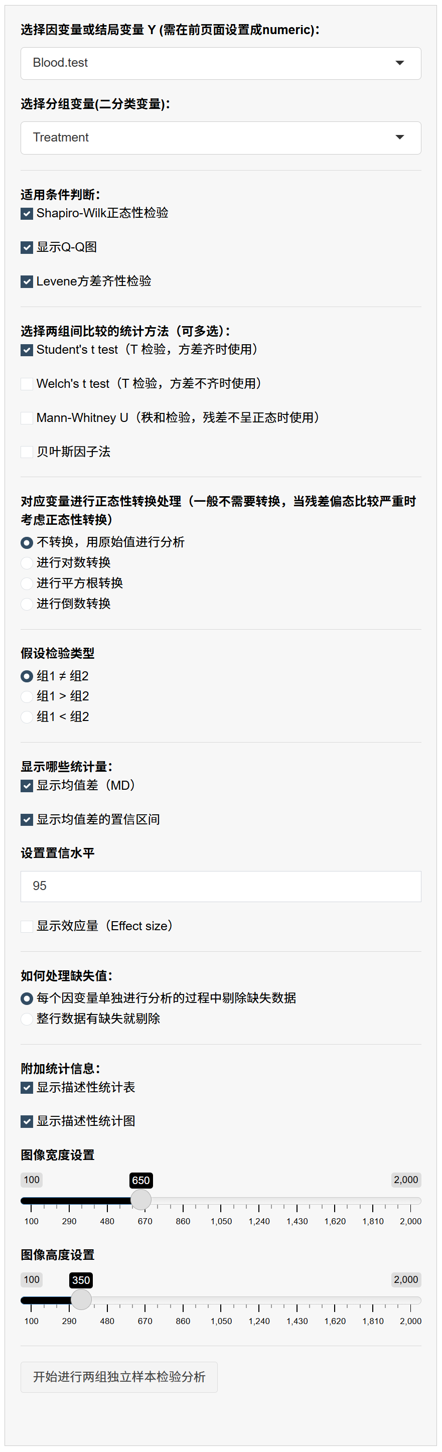 - Shapiro–Wilk 正态性检验(默认开):判断两组数据是否近似正态。