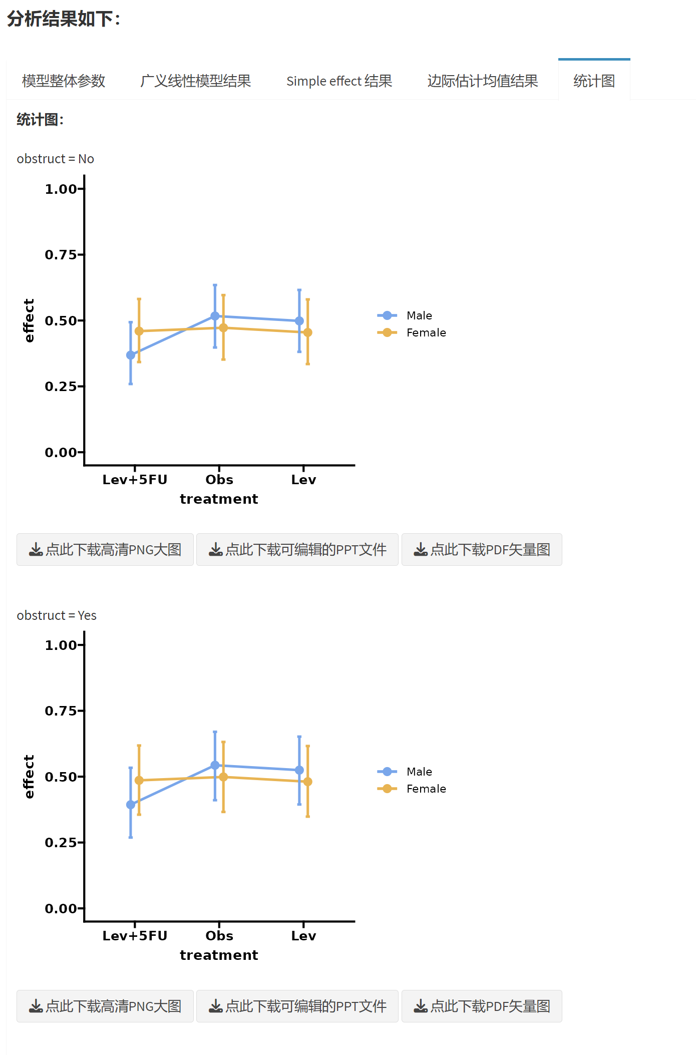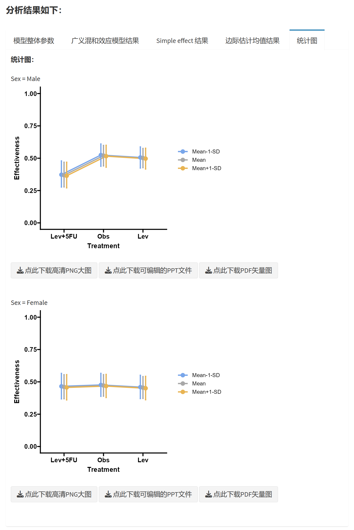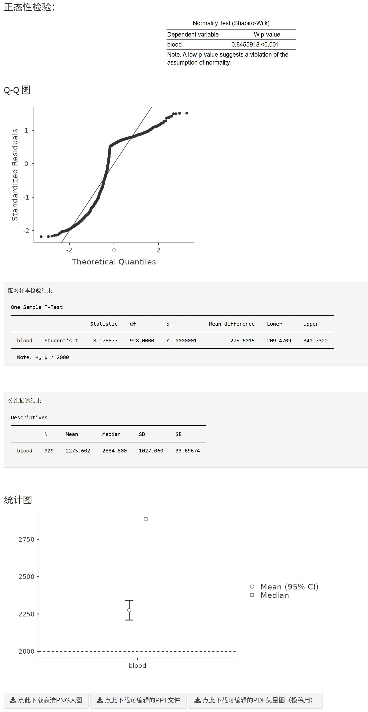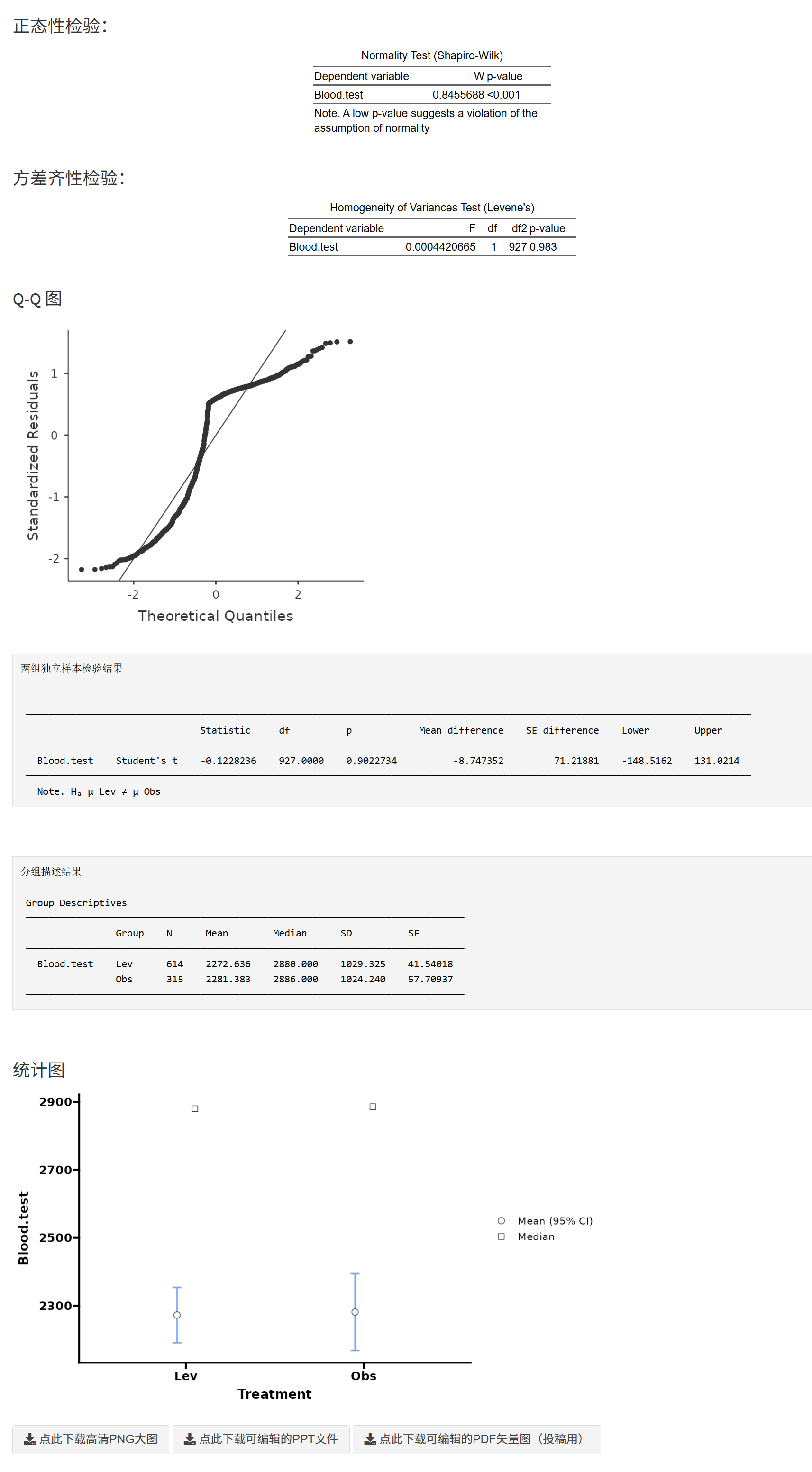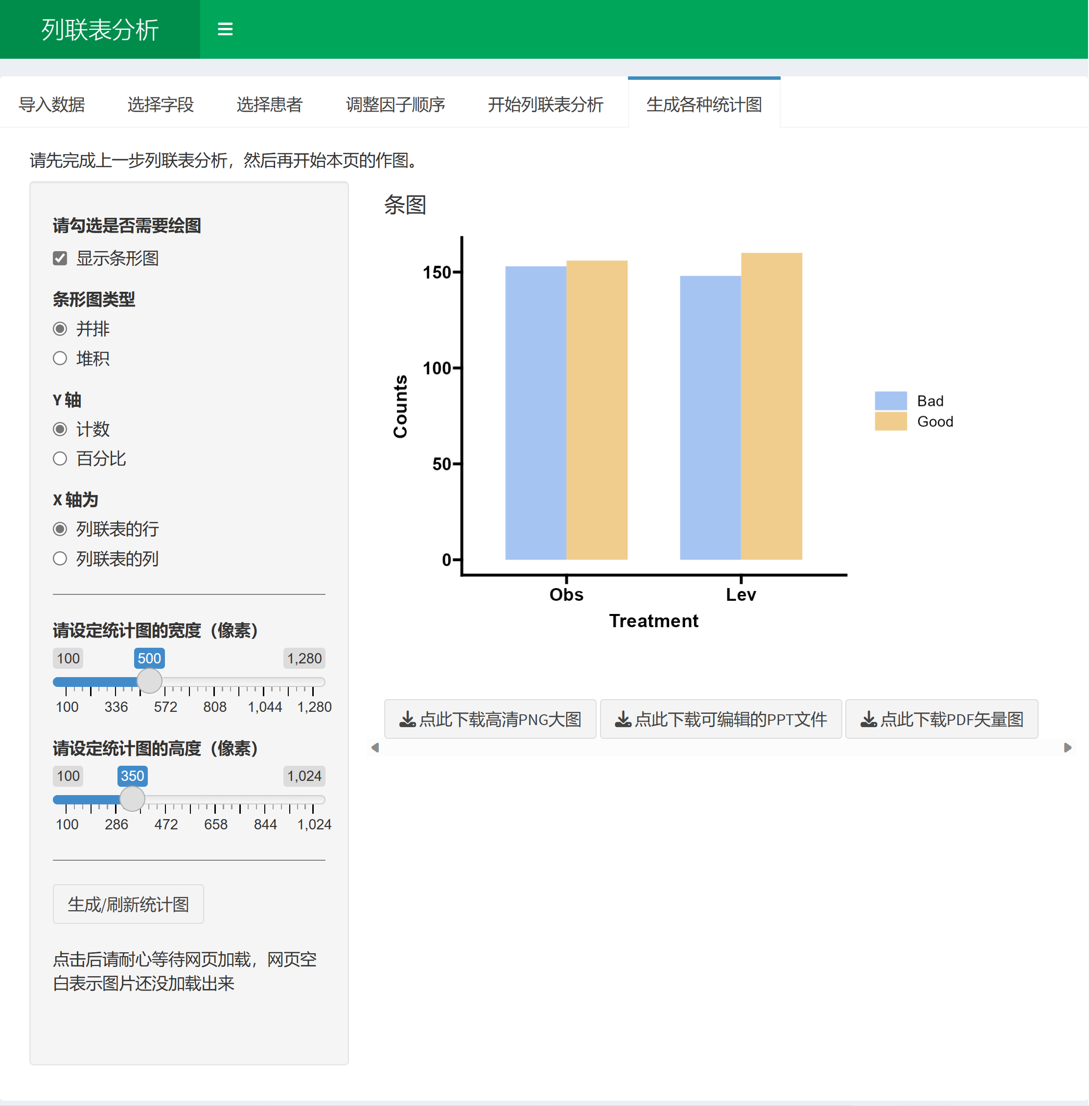 - 描述性统计图:默认开启,可调 图像宽度/高度;图下方提供下载按钮(PNG/PPT/PDF)。