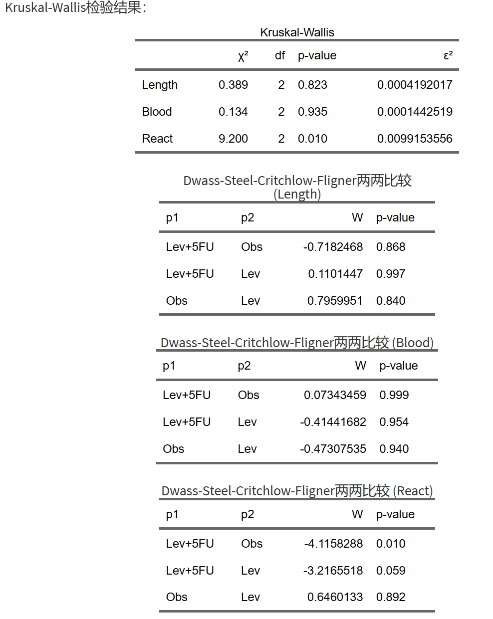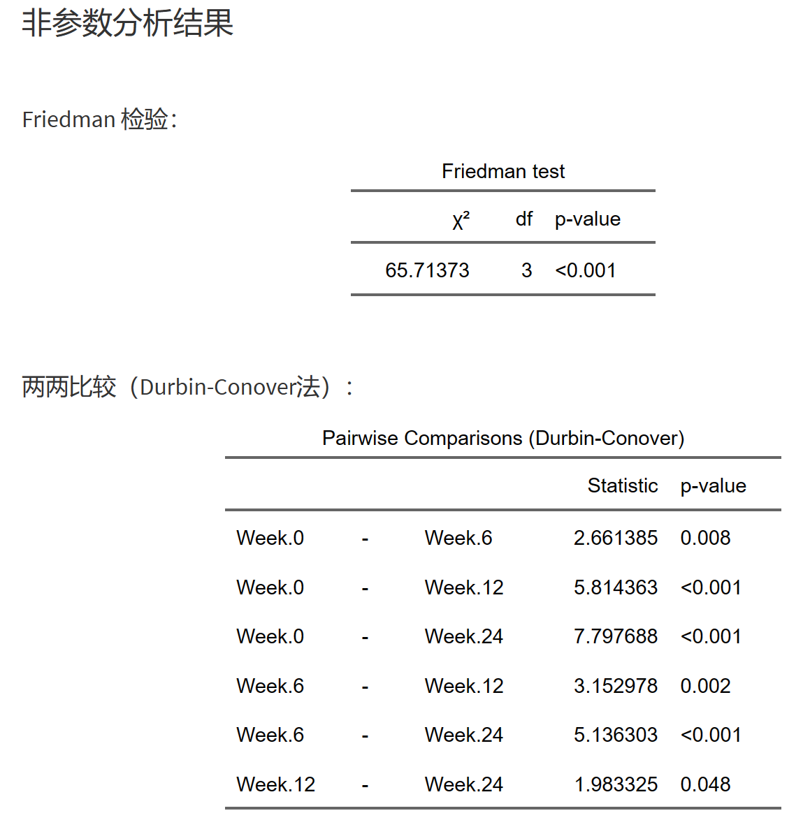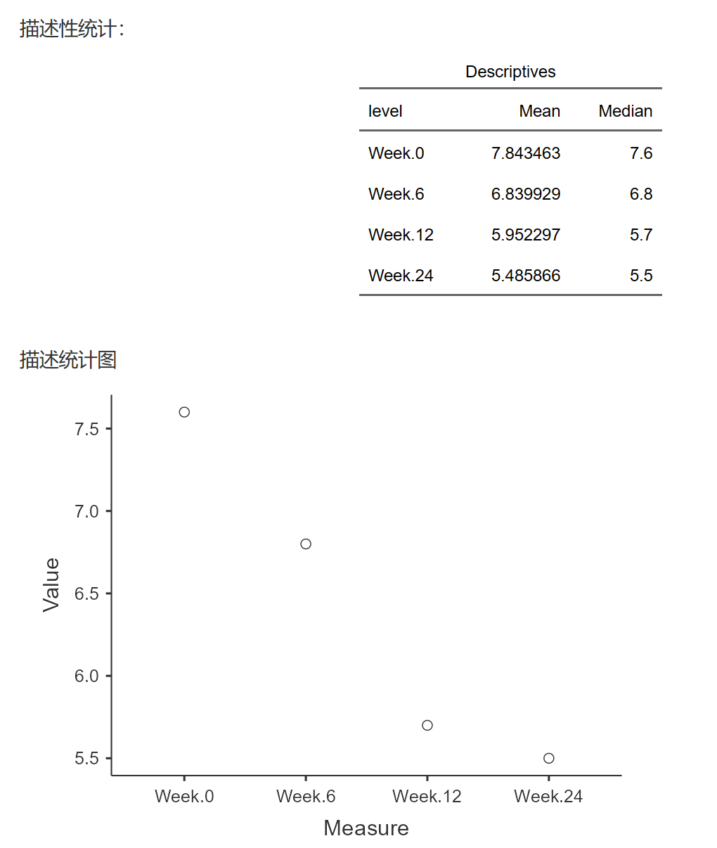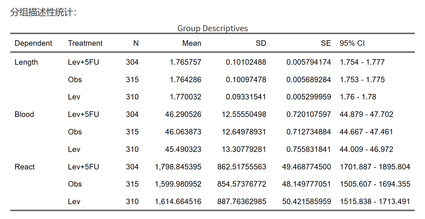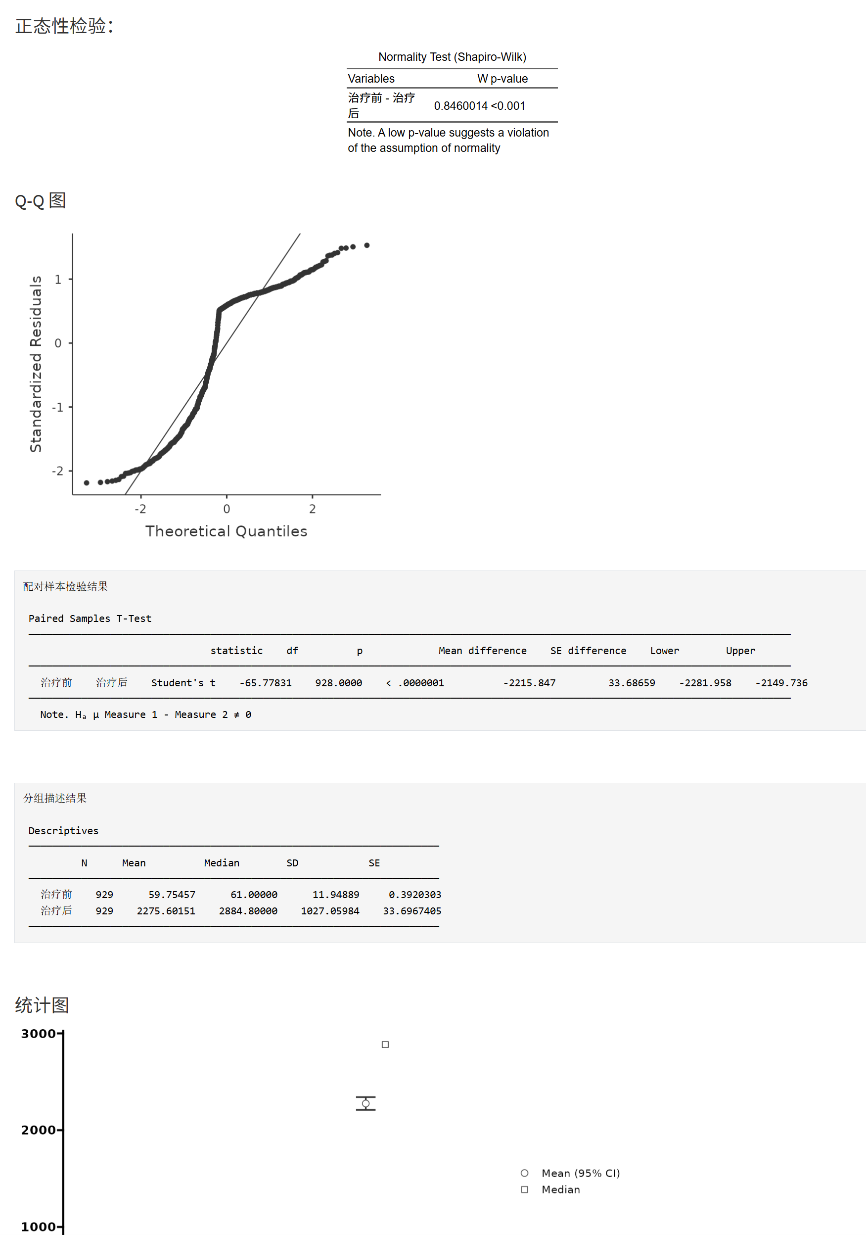 - 描述性统计表:输出两组的均值/SD 或中位数/IQR(由底层自动选择/展示)。