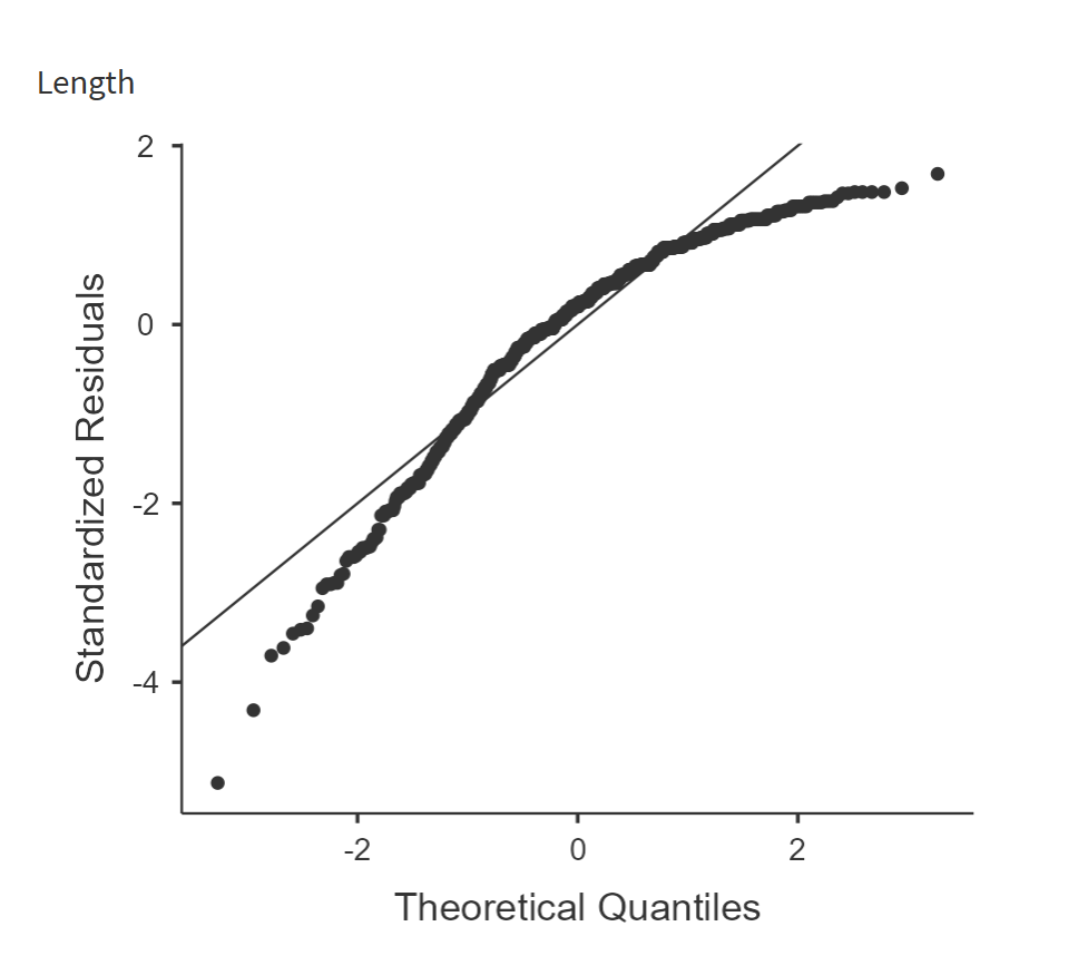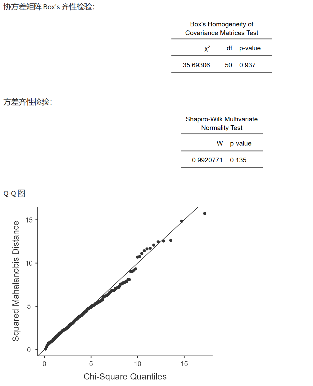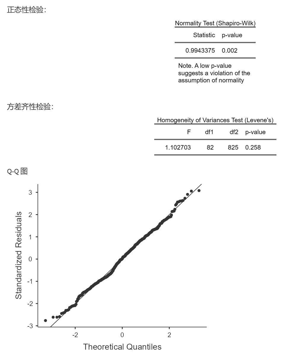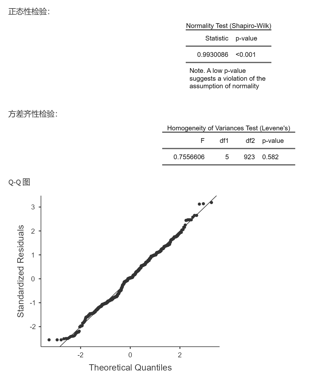 - Shapiro–Wilk 正态性检验:p 值小提示偏离正态;大样本下对微小偏离也很敏感,需结合 Q–Q 图。
