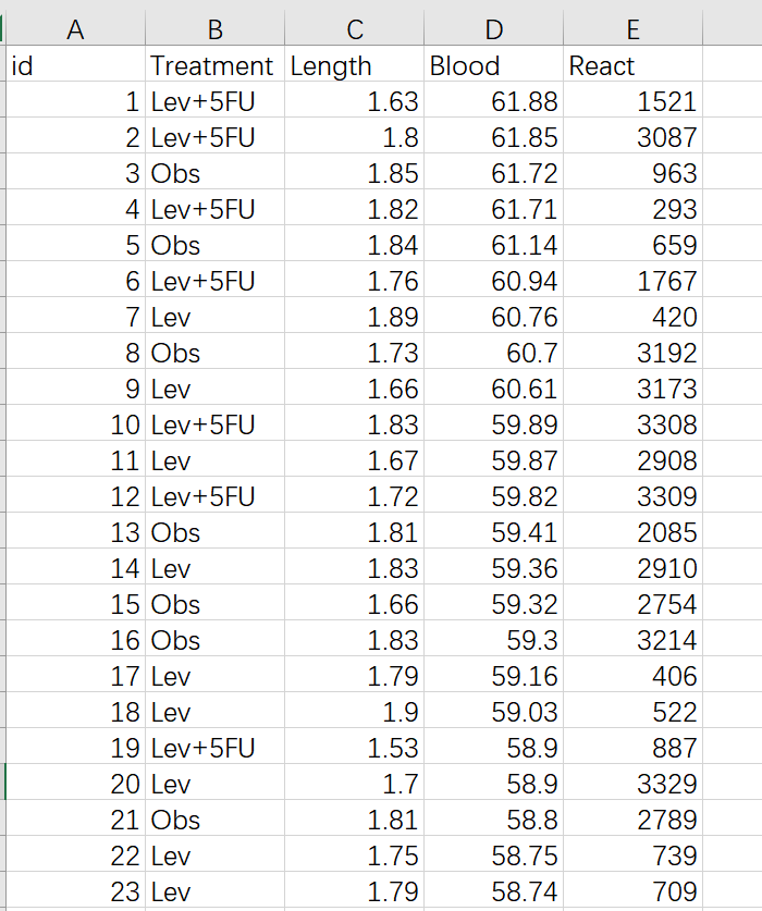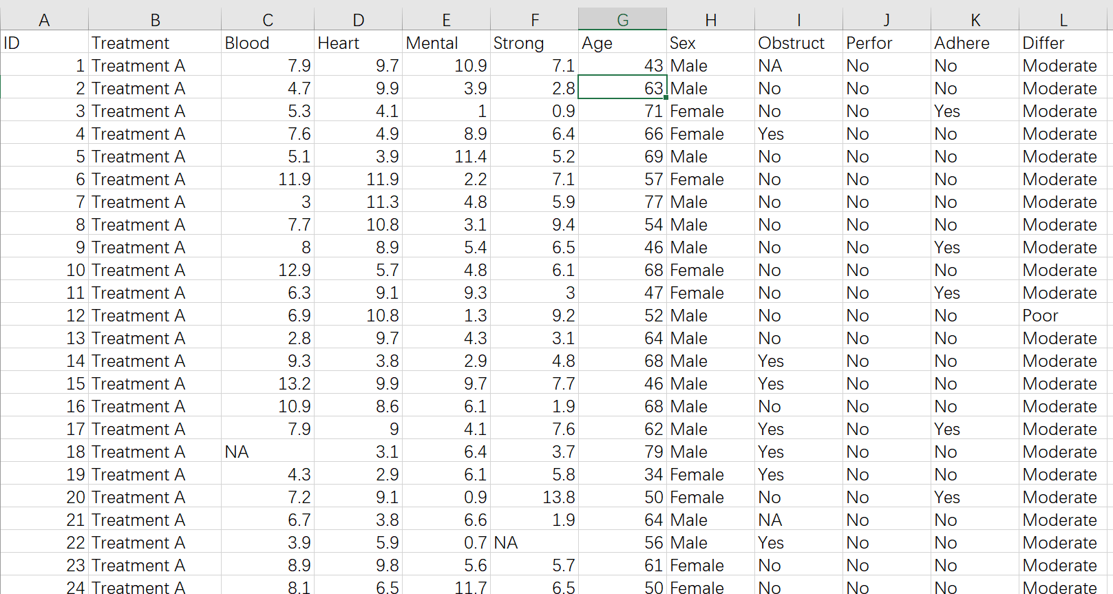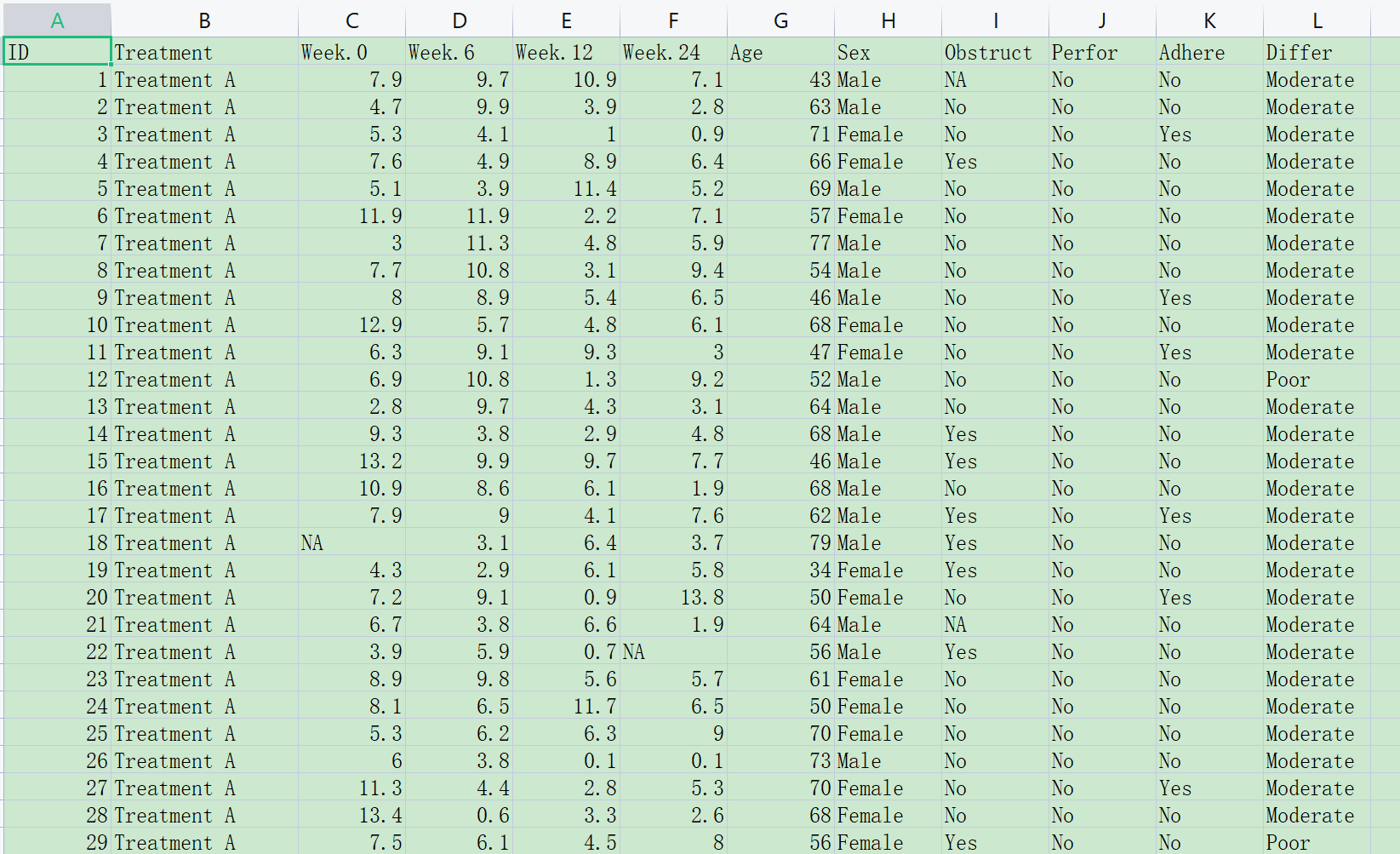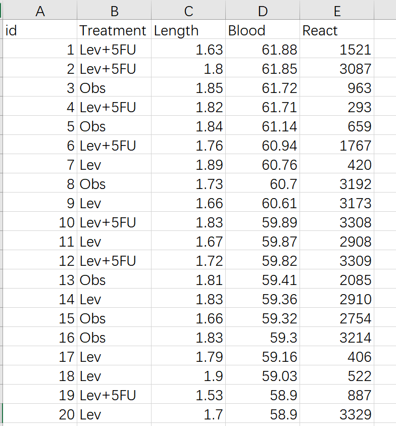 id(可选):受试者编号,便于核查;group:二分类分组(如 Treatment / Control,或 Male / Female);y:连续结局(如 血压下降值 mmHg、CRP、住院天数 等)。