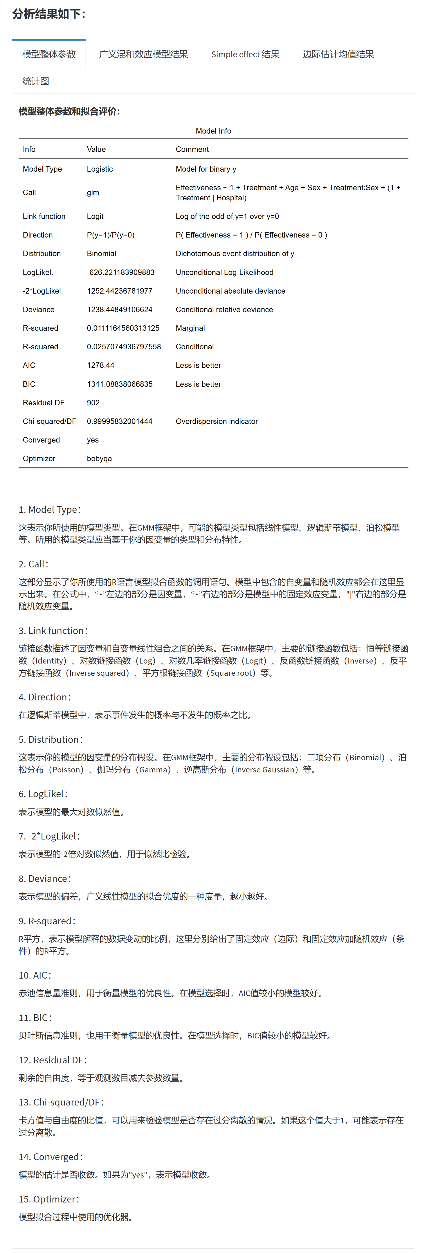 例如,在医学研究中,我们可能关注某种疾病的发生率是否与特定的风险因素有关,同时考虑到各个医院的影响。此时,我们的因变量是二项分布(患病与否),自变量是风险因素(如年龄、性别、吸烟与否等),随机效应可以是医院(即不同医院可能会对疾病的发生率产生不同的影响)。通过广义混合效应模型,我们可以有效地建立因变量、自变量和随机效应之间的关系,从而更准确地探索特定风险因素对疾病发生的影响。