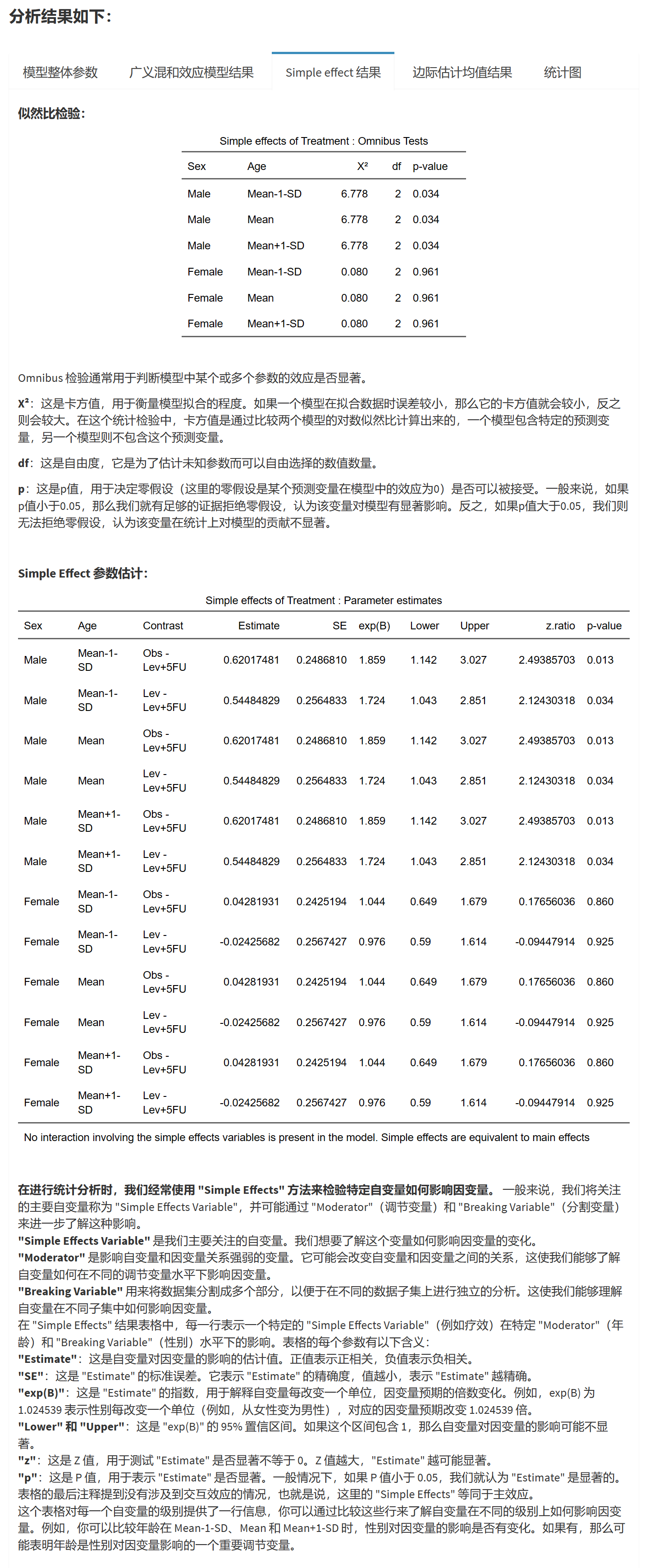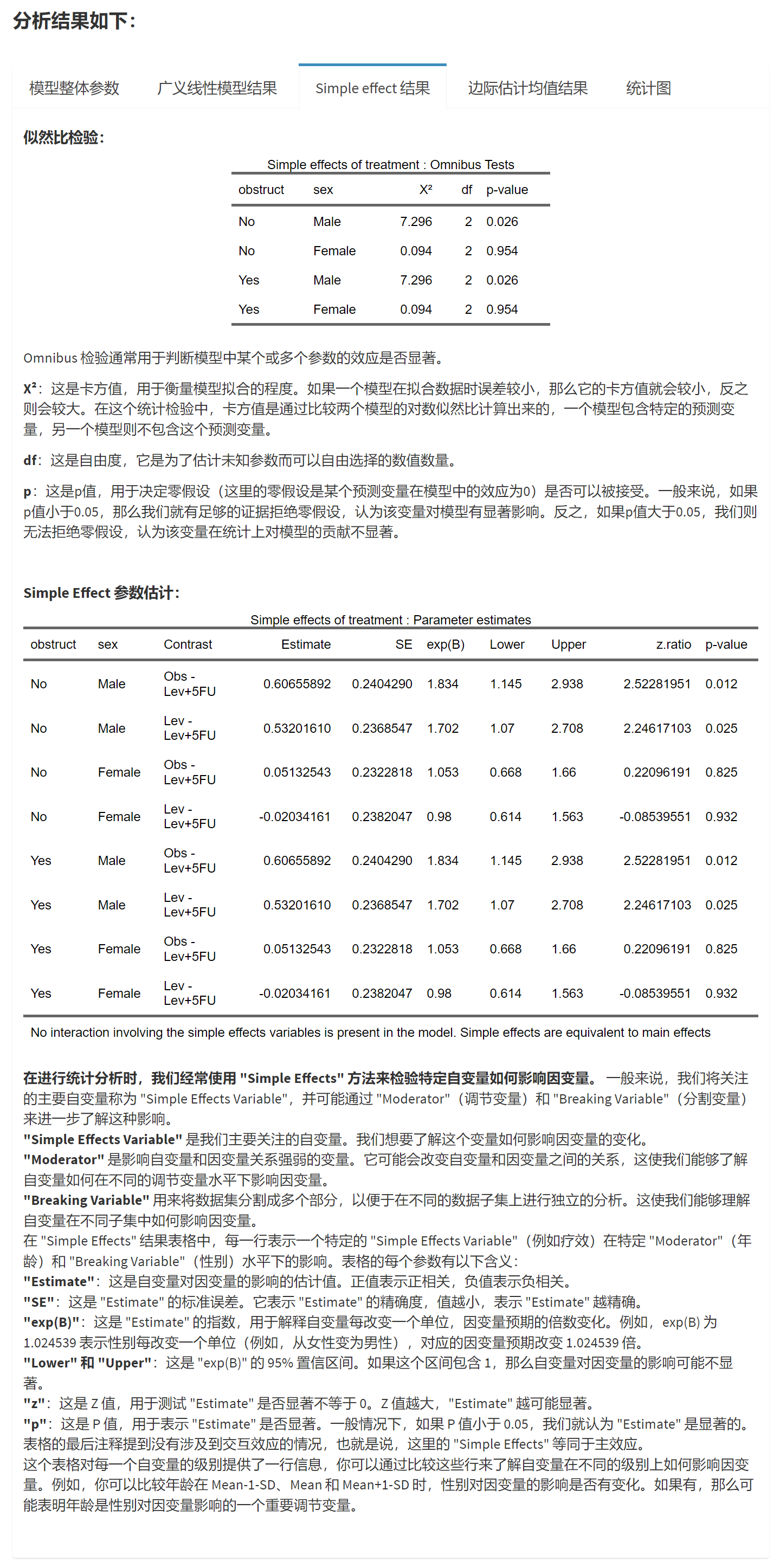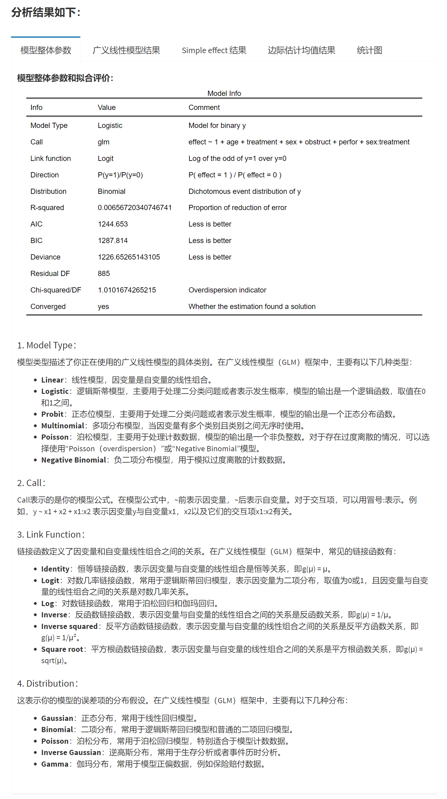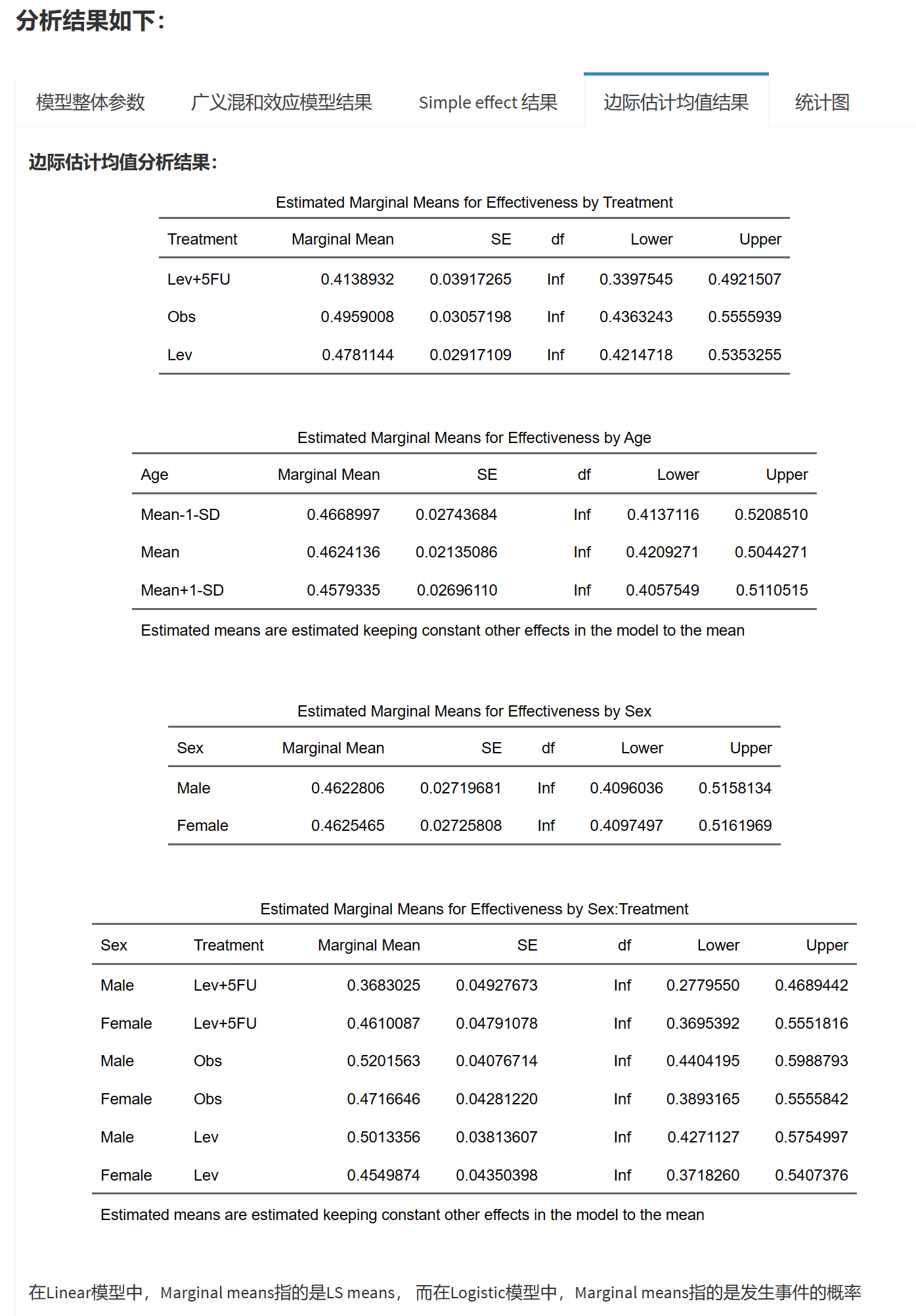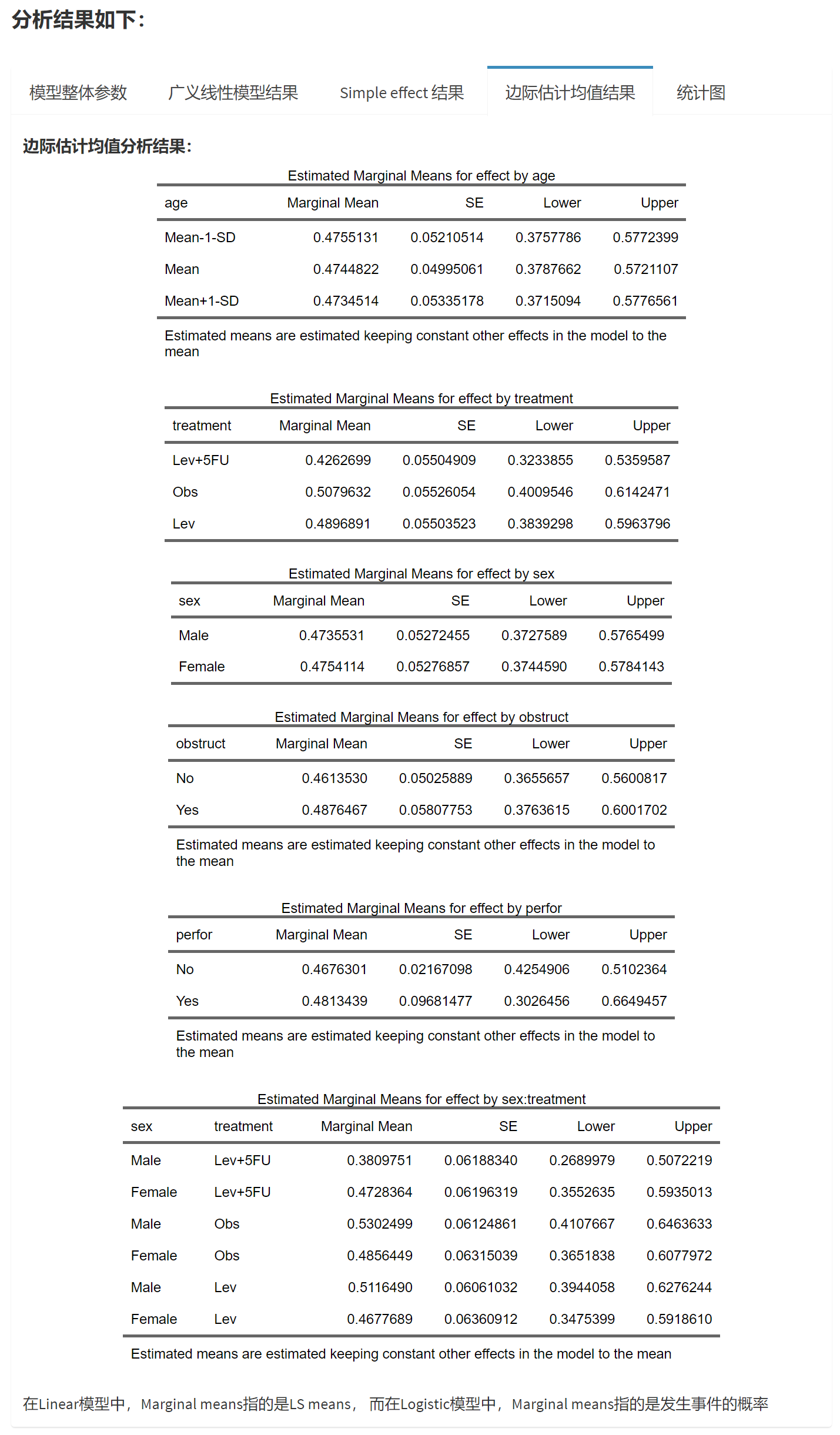 MSTATA支持的功能有:设置模型、设置分布、设置链接函数、设置交互作用、设置分类变量参照组、设置连续性变量转换和标化、设置Contrast分析编码、进行事后检验、多重比较P值调整、进行简单效应(Simple effect)分析、进行边际估计均值(LSmeans、事件发生概率等)分析、绘制统计图,以及设置随机效应和固定效应。