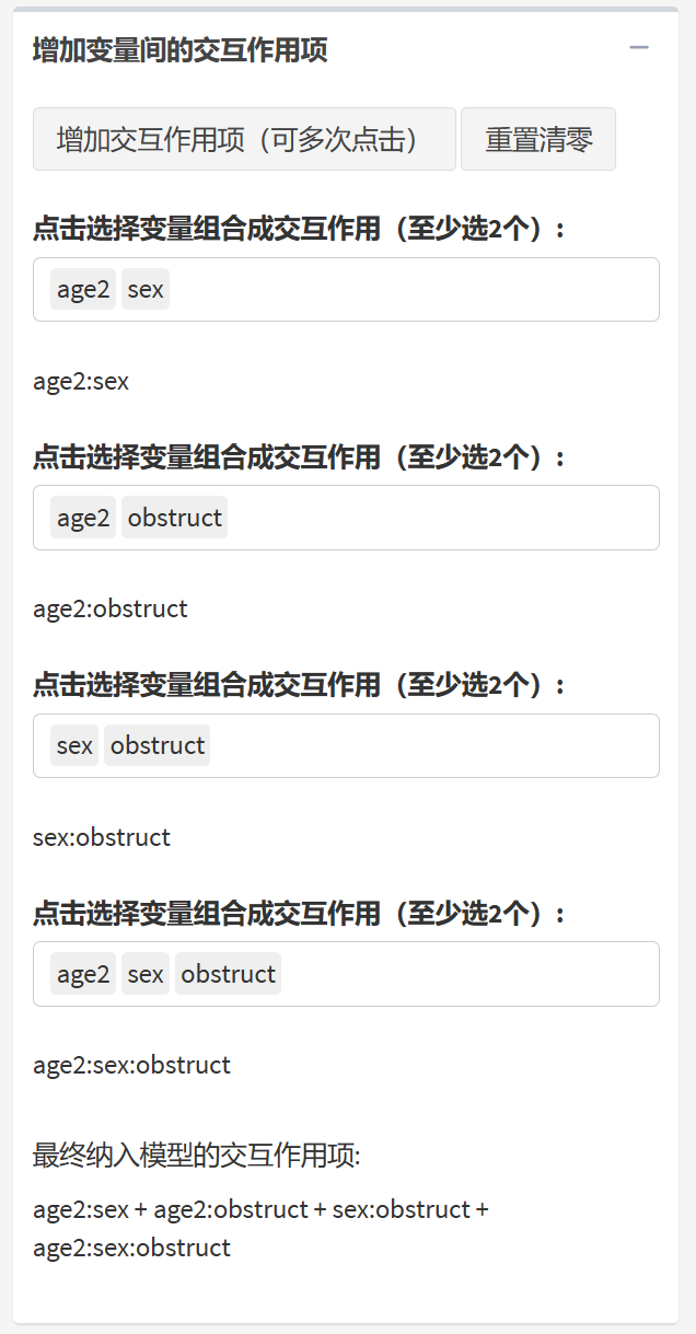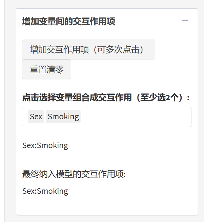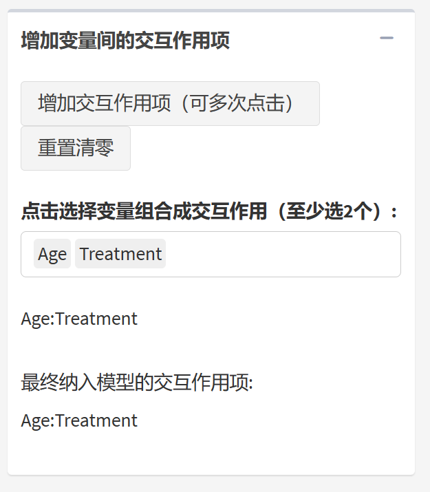 如果选择了 Hospital,则随机效应的下拉选单里,会出现 Intercept | Hospital, 表示随机截距,还会出现前面选择的固定效应 | Hospital 的选项,表示随机斜率。如果只是校正一下人群在医院的聚集性,因为疗效可能受到医院医生、条件、软硬件的影响,从而疗效不同,但又无法详细探究这些因素(无法在固定效应中定义)时,选择 Intercept | Hospital 就够了,用随机截距模型。