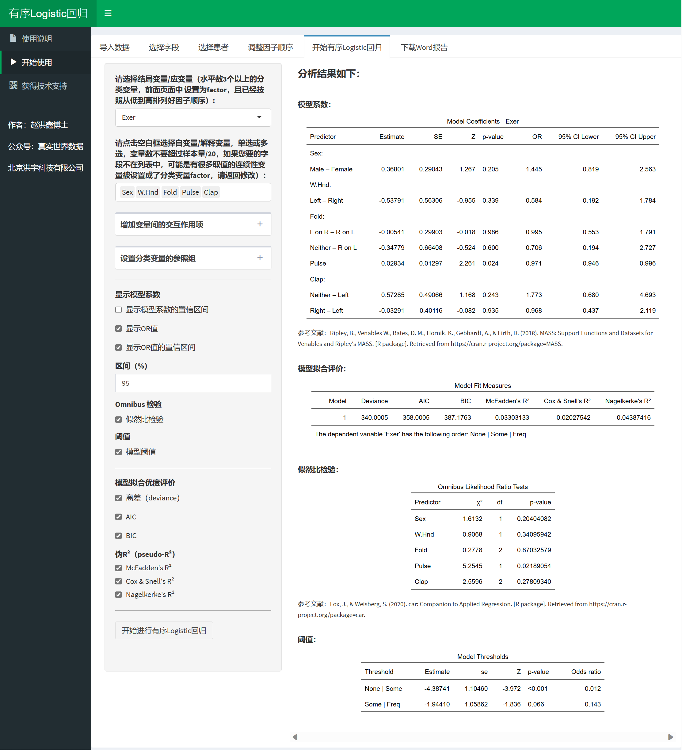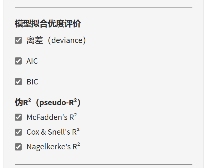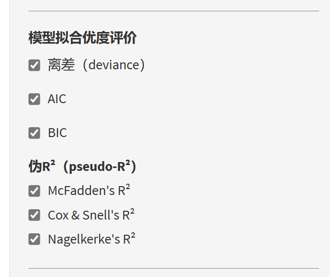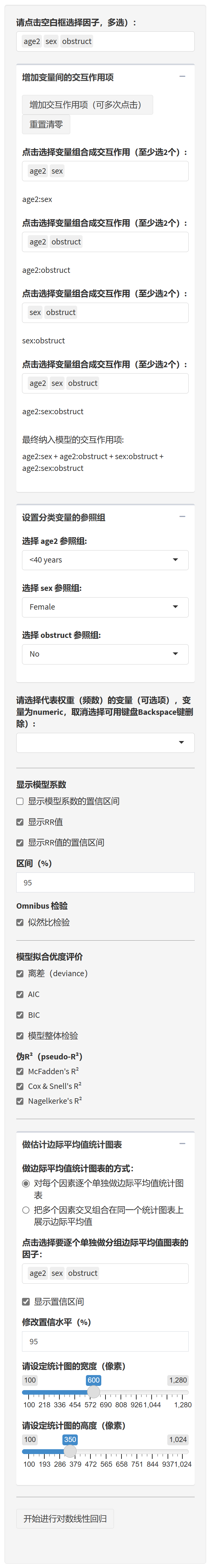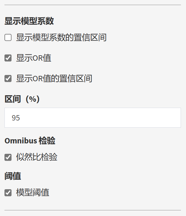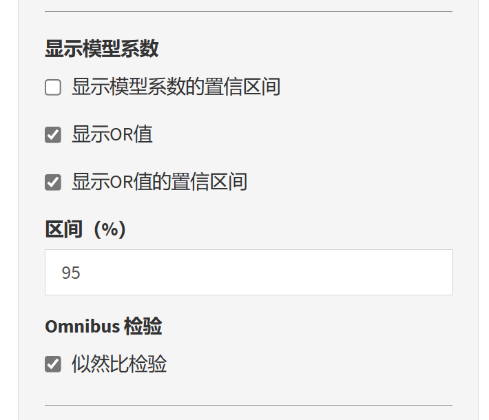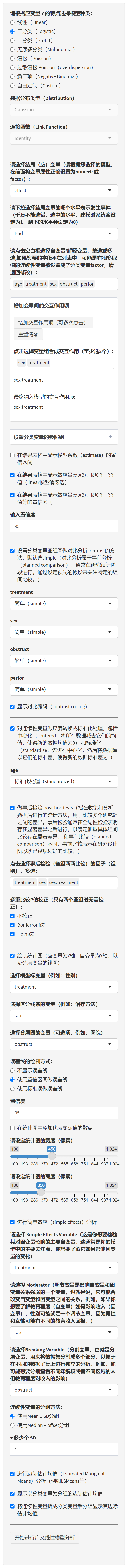 您需要在”模型选择”框中选择一个统计模型。可选的模型包括 Logistic 模型、Probit模型、泊松模型、负二项分布模型等。如果您选择”自定义”,那么您将可以选择具体的”自定义家族”和”自定义链接函数”。