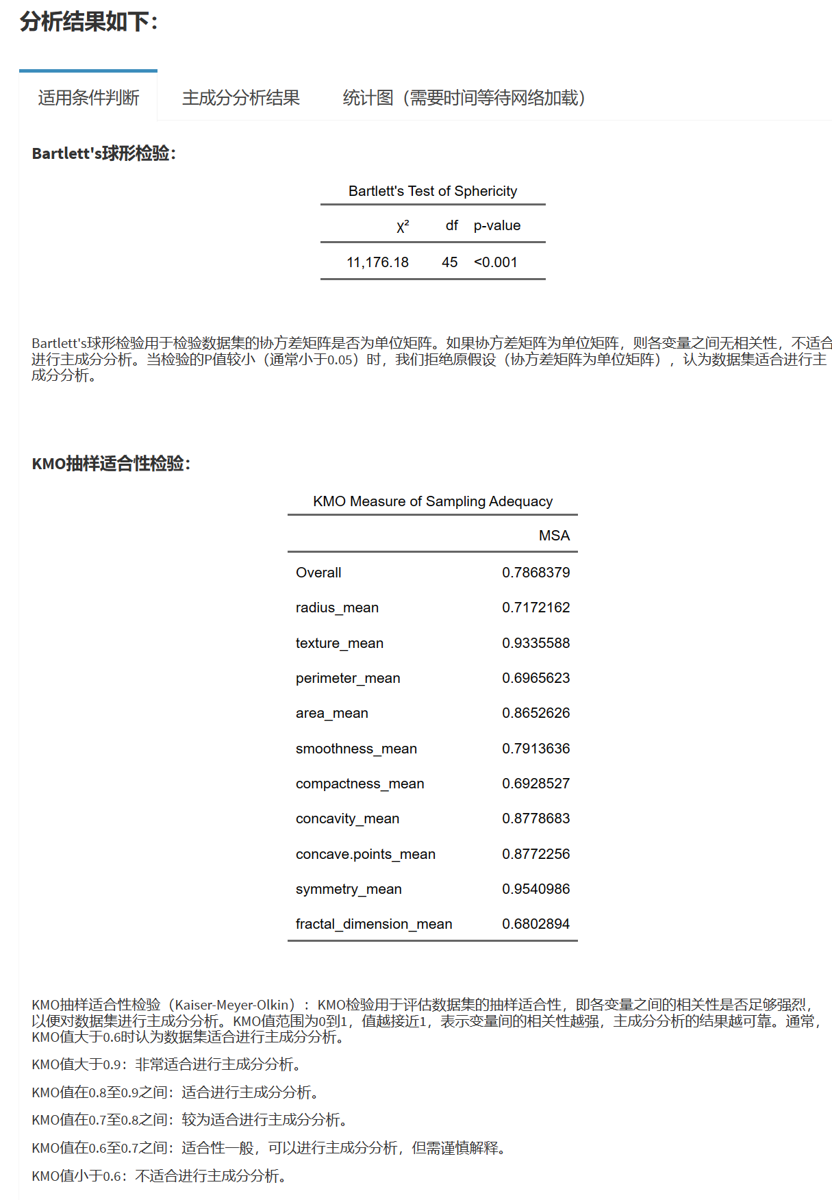 Bartlett’s球形检验:Bartlett’s球形检验用于检验数据集的协方差矩阵是否为单位矩阵。如果协方差矩阵为单位矩阵,则各变量之间无相关性,不适合进行主成分分析。当检验的P值较小(通常小于0.05)时,我们拒绝原假设(协方差矩阵为单位矩阵),认为数据集适合进行主成分分析。