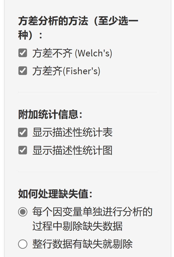 - 每个因变量单独剔除缺失(默认):保证尽可能多的有效样本,但不同结果的样本量可能不同。