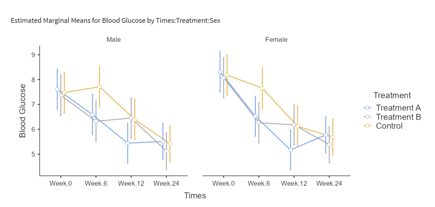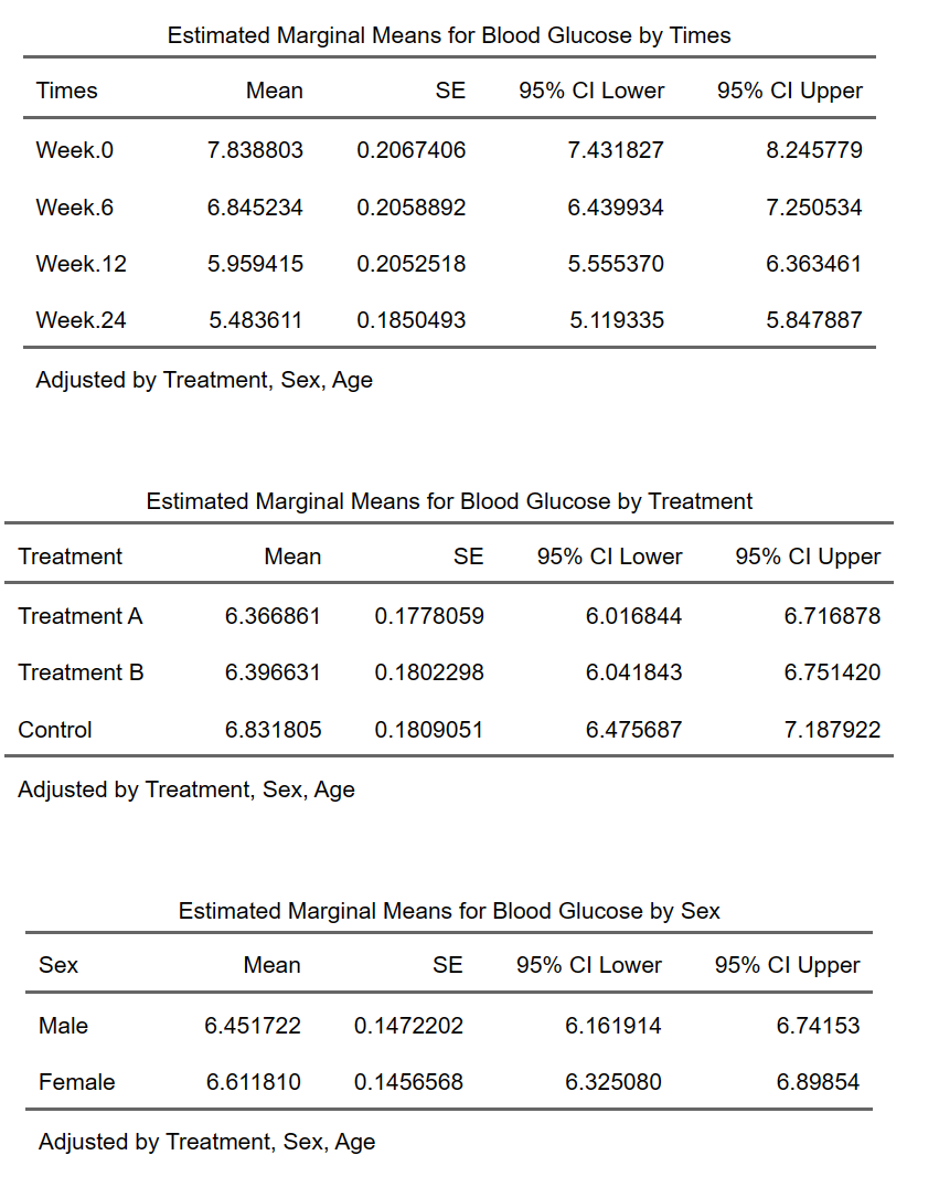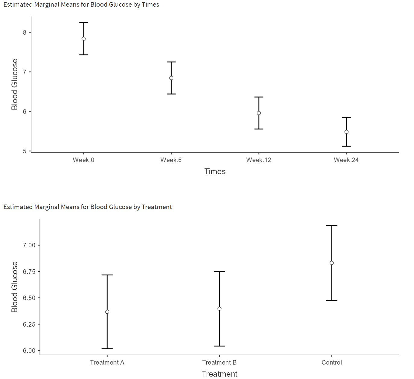 然而,每个患者的血糖水平并不是只受固定效应影响,他们的基线健康状况、生活习惯、遗传背景等个体特性也会对血糖水平产生影响。同一患者在不同时间的血糖水平测量值之间往往存在一定的相关性,即他们具有聚集性,这是由于他们受到同一个个体特定特性的影响。这种在个体间的测量值的聚集性或相关性,可以通过引入随机效应来进行建模。