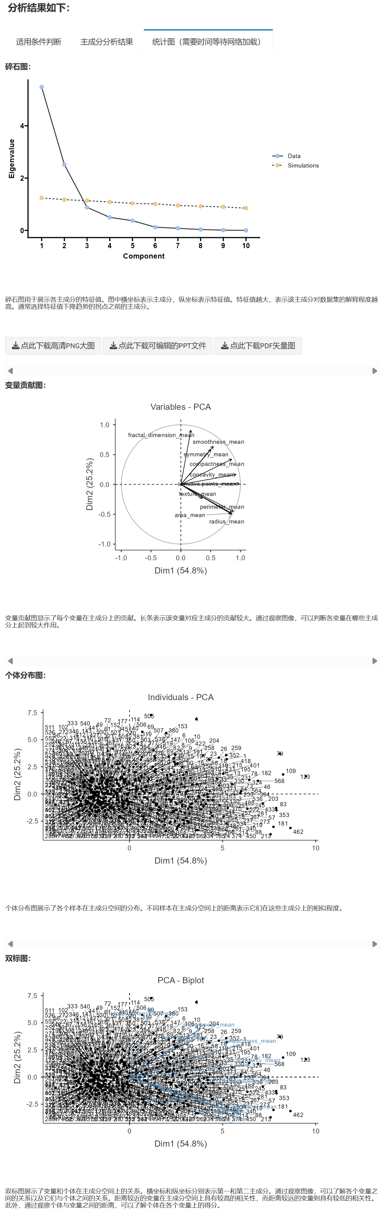 碎石图展示了每个主成分的特征值,有助于确定保留的主成分数量。变量贡献图显示了每个变量对各个主成分的贡献程度。个体分布图描绘了观测值在主成分空间中的位置,以便了解它们在主成分上的分布。双标图综合展示了观测值和变量在主成分空间中的关系,有助于解释主成分在实际问题中的意义。