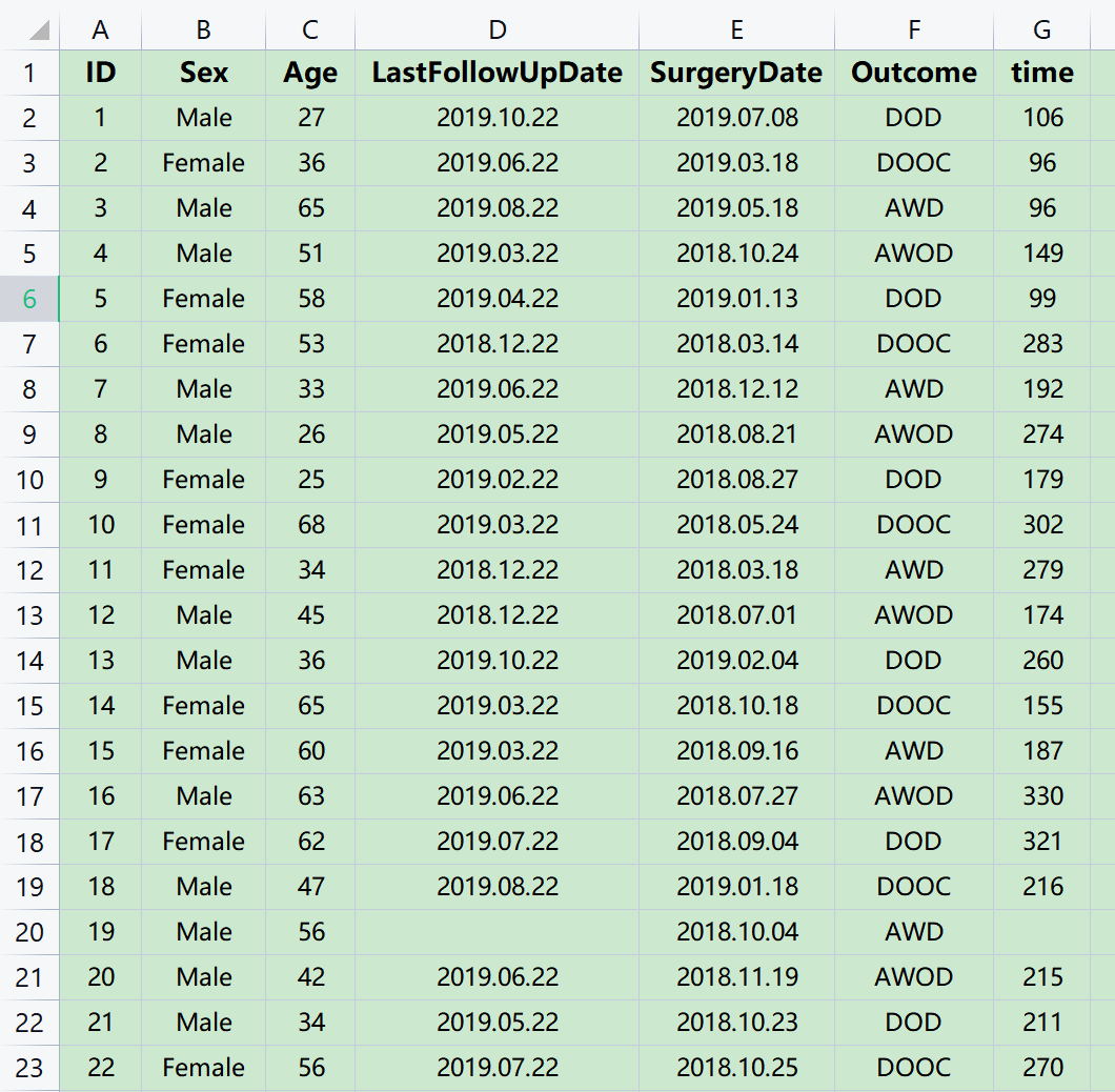 整洁数据格式(每行一名受试者):至少包含 1 列连续型结局(Y)和 1 列二分类分组变量(Group)。两列都应在 “定义字段” 中设定为正确类型:Y 为 numeric/integer,Group 为 factor(恰好两类)。